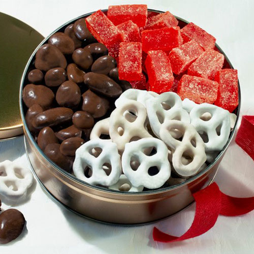 Delight your taste buds with delicious sweets in our newest candy tin. Savor every bite of chocolate-covered Pecans yogurt-covered Mini Pretzels, and juicy Cherry Jellies. A real treat for anybody!