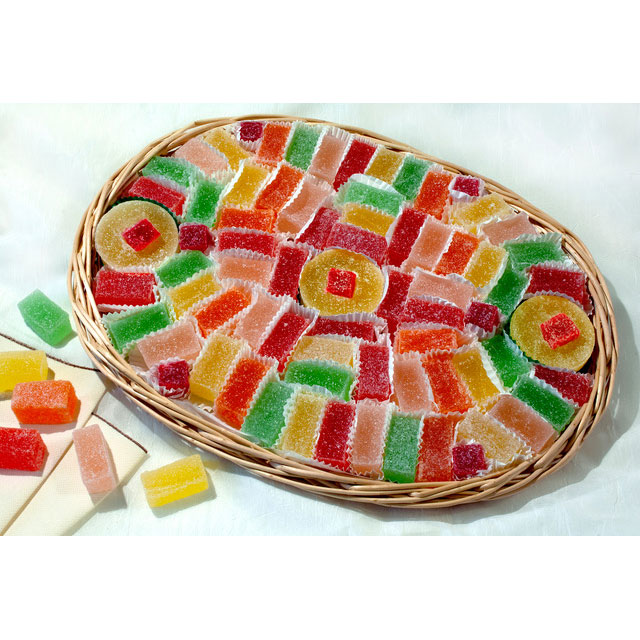 Citrus gourmet candies made fresh in our Florida kitchen, then sent straight to you! This wicker basket is filled with orange, lemon, and lime citrus delicacies, creamy Pecan Log slices, and Candied Cherries.